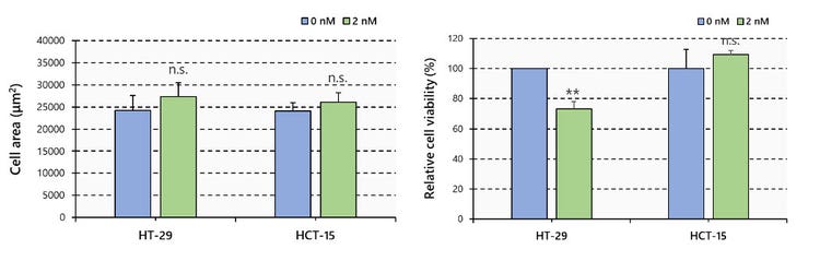 经PTX处理和未经处理的细胞球之间没有观察到面积上的差异。另一方面,荧光信号显示PTX显著减少了HT-29中的活细胞数量,而HCT-15细胞球中的活细胞数量没有减少(图3)。
