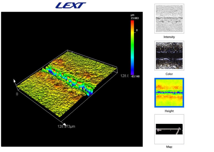 - 在采集过程中,综合使用显微镜的405 nm激光源、0.8 nm光学Z轴标度、4K扫描技术和专用的LEXT物镜,可以精确地测量激光沟槽的3D轮廓。