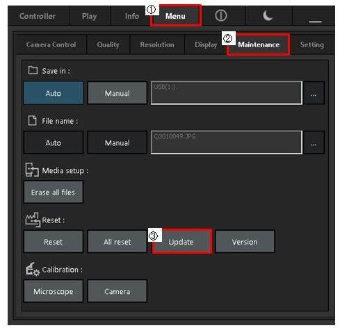 (3) After the camera control software’s boot, select ① [Menu] → ② [Maintenance] → ③ [Update].
