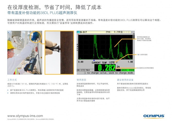 38DL PLUS Ultrasonic Thickness Gage with Temperature Compensation Infographic