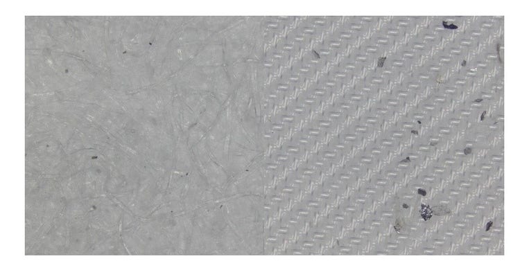 在白色背景下拍摄的滤膜图像。网式滤膜(右)有明显的编织图案,而纤维素滤膜(左)不会让过滤器背景透出。