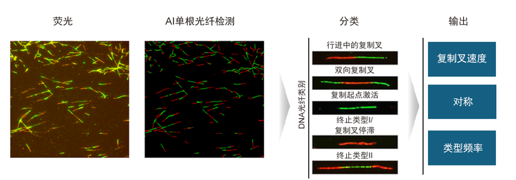 而在2025年的最新案例中,一位研究人员利用scanR的AI与细胞计量功能,开发出名为 “基于AI的定量DNA纤维分析流程” 的新方法。该工作流程通过自动检测显微镜成像的单个DNA纤维,实现了复制应激反应的自动化研究。2虽然DNA纤维分析技术本身早已存在,但传统方法完全依赖人工图像采集与分析,不仅耗时耗力,还容易受到操作者主观偏差的影响。这项基于AI的定量DNA纤维分析(qAID)新流程,可在数十分钟内完成数千条DNA纤维的成像与多参数分析。