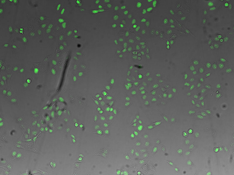 利用TruDetect技术在明场图像中采集的细胞核(绿色)荧光图像、(蓝色)细胞核