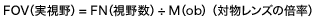 接眼レンズで実際に観察している視野が、標本上ではどれだけの範囲にあたるかを示したものを「実視野(FOV:Field Of View)」といい、次の式で求めることができる。