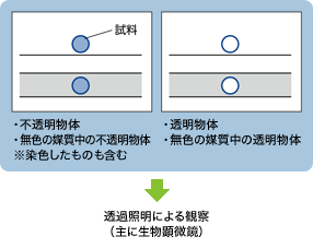 照明光は試料の下から試料を透過して対物レンズに入る。透過照明では生体組織の薄切切片や細胞、細菌などの観察や鋭利な刃先やエッジ状の端面の観察を行う。