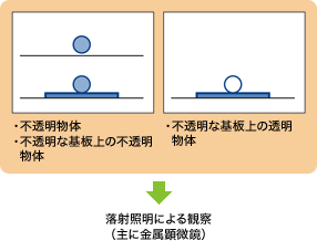 試料が光を通さないため、対物レンズ側から試料に照明をする方法で、対物レンズがコンデンサの役割を担っている。