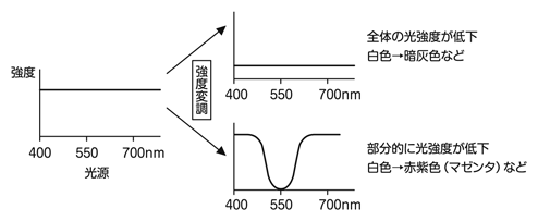 試料の分光透過率特性、分光反射率特性によって、光源からの光の分光特性が変わること。