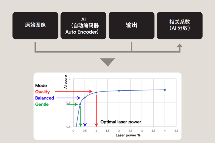 - 系统针对每张图像计算 AI 得分,用以评估图像质量(图 7 中的步骤 1-3)。 系统将 AI 评分绘制成图表,并根据图表和所选模式估算最佳激光功率(见图 7 的步骤 4)。