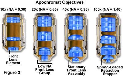 如图2和图3所示,复消色差 物镜的校正水平(和费用)较高。复消色差透镜是目前校正度较高的显微镜透镜,其高昂的价格反映了其制造所需的复杂设计和精心装配。在图3中,我们比较了放大倍率从10x到100x的一系列复消色差物镜的透镜元件。与高放大倍率(40x和100x)的复消色差物镜相比,低放大倍率复消色差物镜(10x和20x)的工作距离更长,物镜总长度更短。一般来说,复消色差物镜对三种颜色(红、绿、蓝)进行色差校正,几乎可以消除色差,并对两种或三种波长进行球面校正(见表1)。复消色差物镜是在白光下进行彩色显微摄影的理想选择。由于其校正水平高,在给定的放大倍率下,复消色差物镜的数值孔径通常高于消色差物镜或萤石物镜。许多较新的高性能萤石和复消色差物镜可以校正四种(深蓝、蓝、绿和红)或更多颜色的色差和四种颜色的球差。