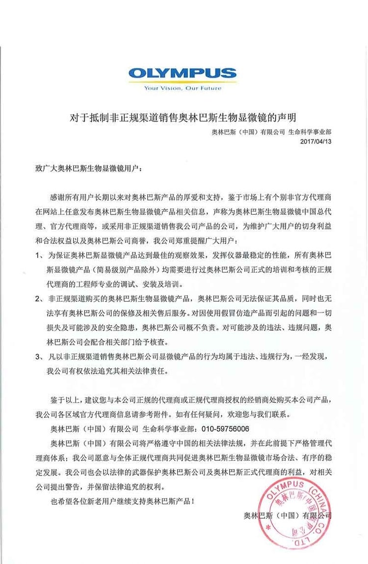 鉴于市场上有个别非官方代理商在网站上任意发布奥林巴斯生物显微镜产品相关信息,声称为奥林巴斯生物显微镜中国总代理、官方代理商等,或采用非正规渠道销售我公司产品的公司,我公司做出以下声明。
