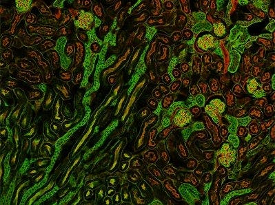 使用TruAI预测小鼠肾脏切片上的肾小球位置(蓝色)。