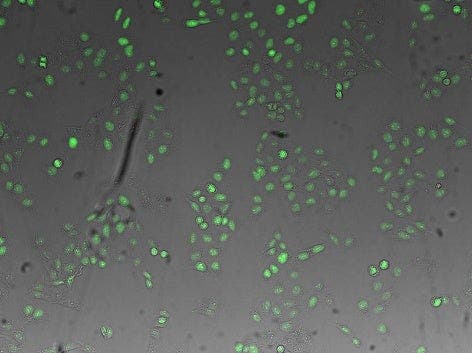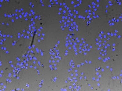 (绿色)细胞核的荧光图像,(蓝色)通过TruAI技术从明场图像中检测到的细胞核