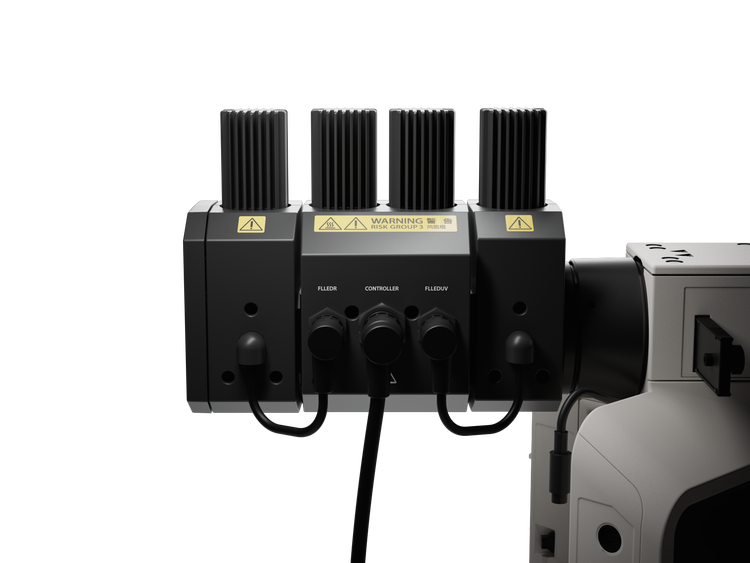 完整的 U-FLLED 系统包含三个模块。 从左到右: U-FLLEDR(深红色)、U-FLLED(蓝色/绿色)、U-FLLEDUV(紫外线)。