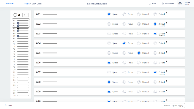 - 根据您的偏好配置扫描仪:可以在4种扫描模式中进行选择,以针对速度、准确性或样品类型(如染色较淡或不平整的样品)进行优化。可以根据实验室的工作流程,定制扫描仪的运行方式。
