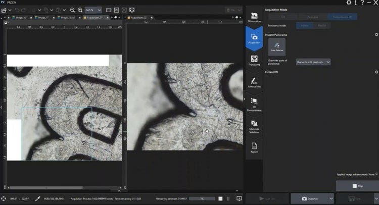 景深扩展成像(EFI)功能可让您通过手动和电动设备在不同焦平面上连续采集多个图像,从而获得完全对焦的图像。全景功能可使您获得大于显微镜视场的图像。PRECiV DSX可以根据以前采集的图像离线计算景深扩展图像(EFI)和全景图像。